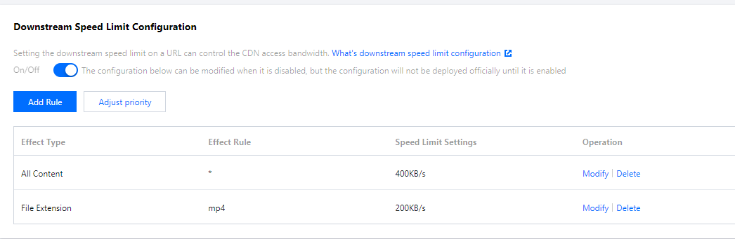 腾讯云 CDN 为您提供了下行限速配置,对服务端单链接下行最大吞吐速度进行设置。