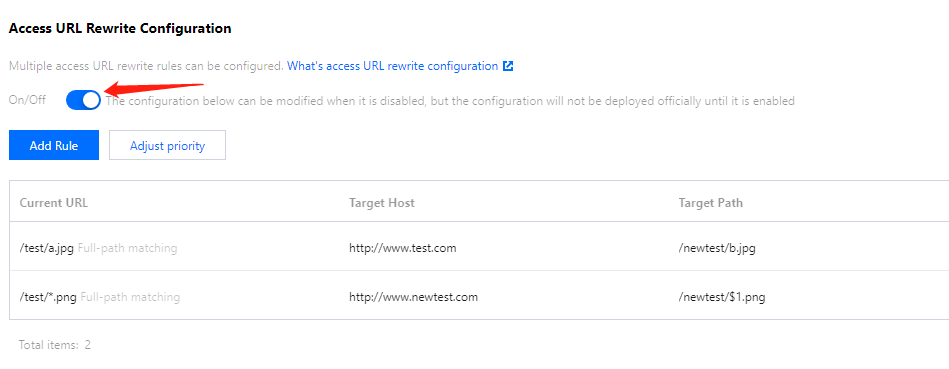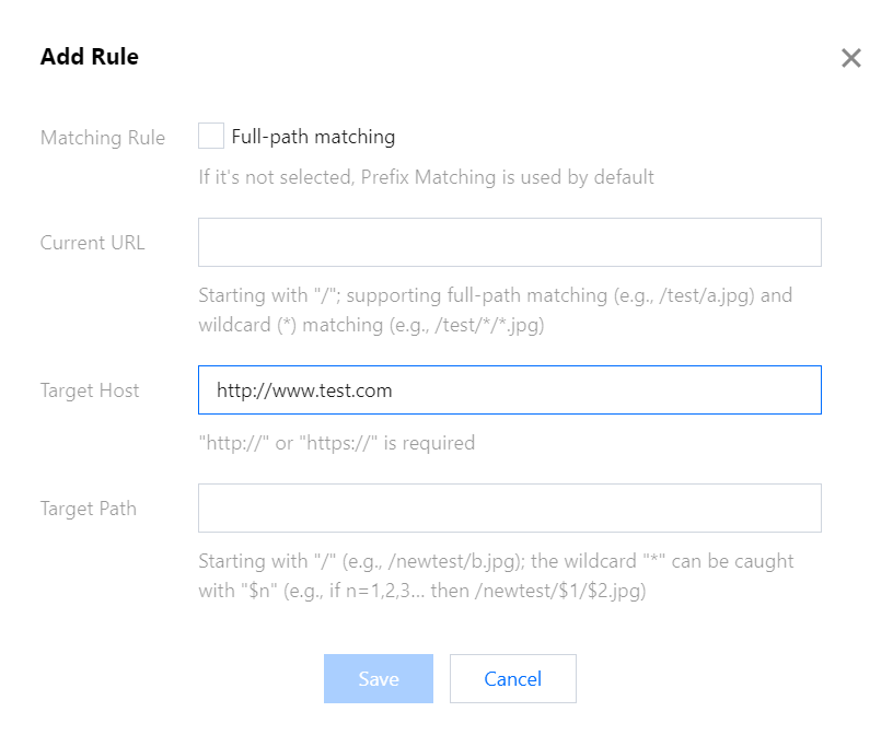 待重写 URL:以/开头,支持全路径匹配(例如:/test/a.jpg)和通配符 * 匹配(例如:/test//.jpg),若需全路径匹配需勾选全路径匹配,若指定文件目录,不能以“/”结尾(例如:/test)。