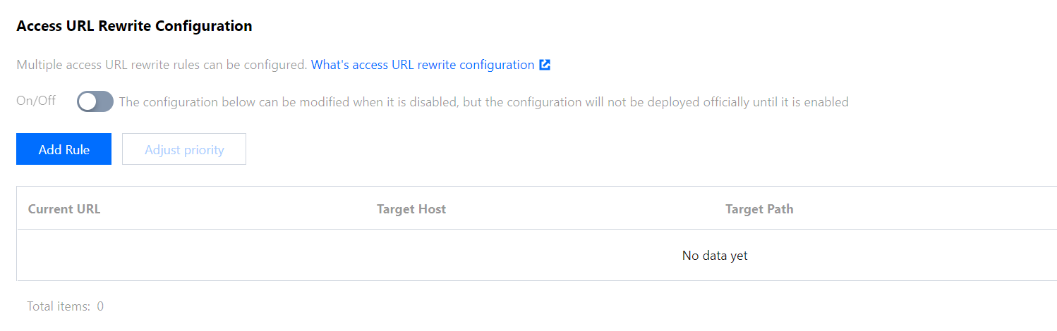 登录 CDN 控制台,在左侧菜单栏选择【域名管理】,单击域名操作列的【管理】,进入域名配置页面,切换 Tab 至【缓存配置】,即可找到【访问 URL 重写配置】。 默认情况下,访问 URL 重写配置为关闭状态:
