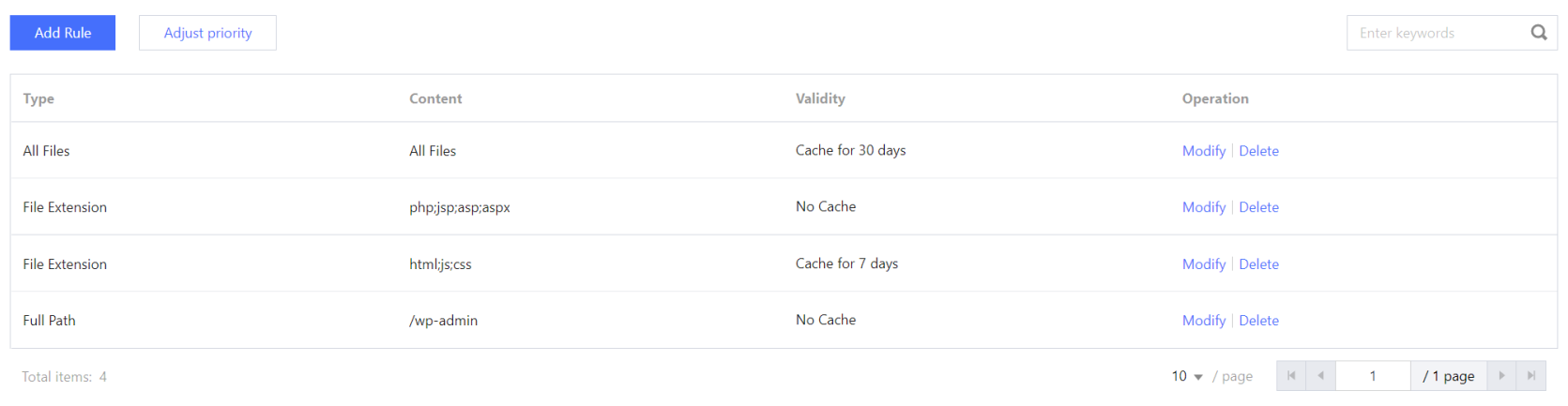 1. 单击新增规则,类型为目录,内容为 /wp-admin,缓存选项为不缓存,单击确定。 2. 单击新增规则,类型为文件后缀,内容为 html;js;css,缓存选项为缓存,缓存时间为7天,强制缓存为否,单击确定。 3. 按照优先级顺序,底部优先级高于顶部,单击调整优先级,拖动"/wp-admin目录不缓存规则"规则调整至底部,使该规则优先级最高。 4. 调整完成后的缓存规则为: