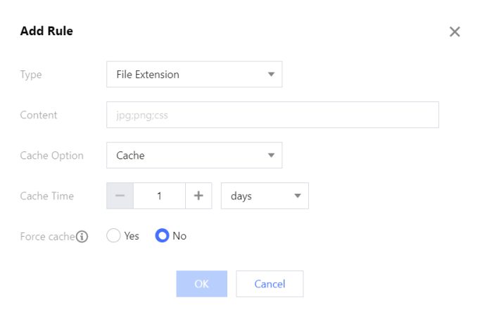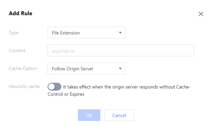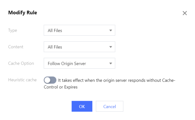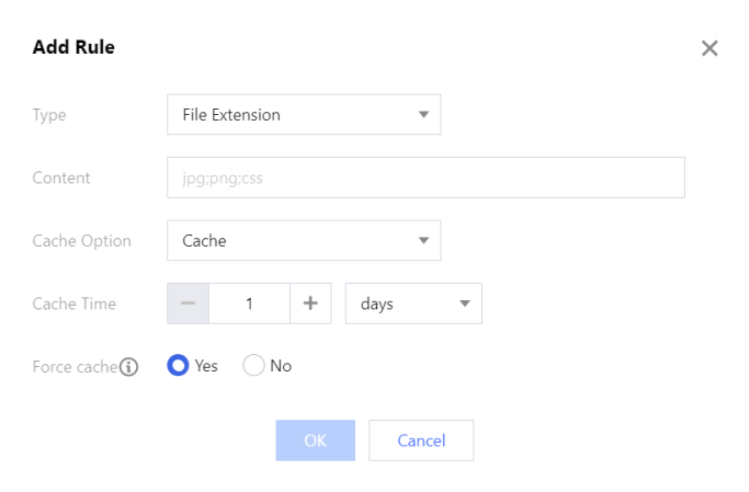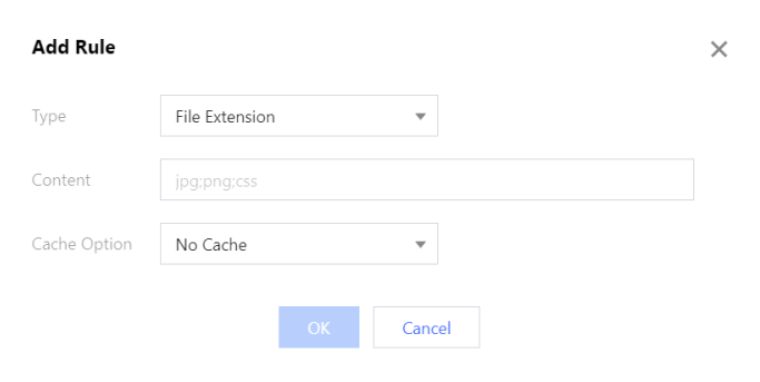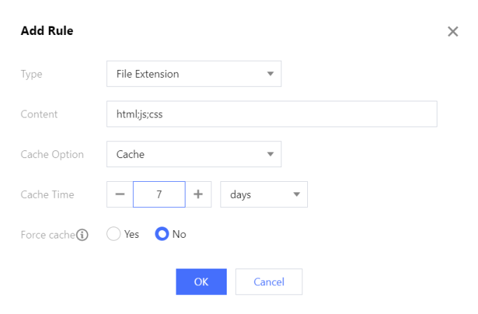 类型 | 支持对全部文件、文件后缀、文件目录、全路径文件、首页进行配置: 全部文件:指定全部文件设置规则,默认规则。 文件后缀:指定文件的后缀设置规则。 文件目录:指定文件的目录设置规则。 全路径文件:指定文件的完整路径设置规则。 首页:指定域名根目录设置规则。 |