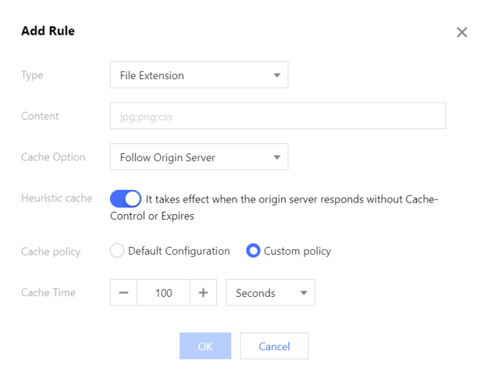 i. 默认配置:如果源站响应头存在 Last-Modified,则缓存时间=(当前时间 - Last-Modified)* 0.1,如果源站响应头不存在 Last-Modified,则默认缓存时间为 600 秒。