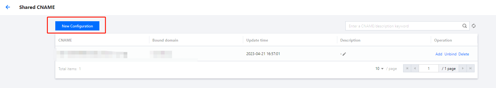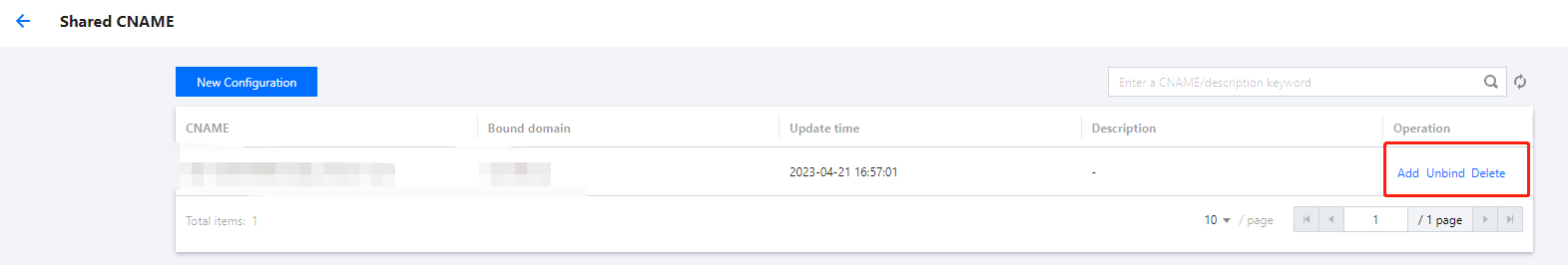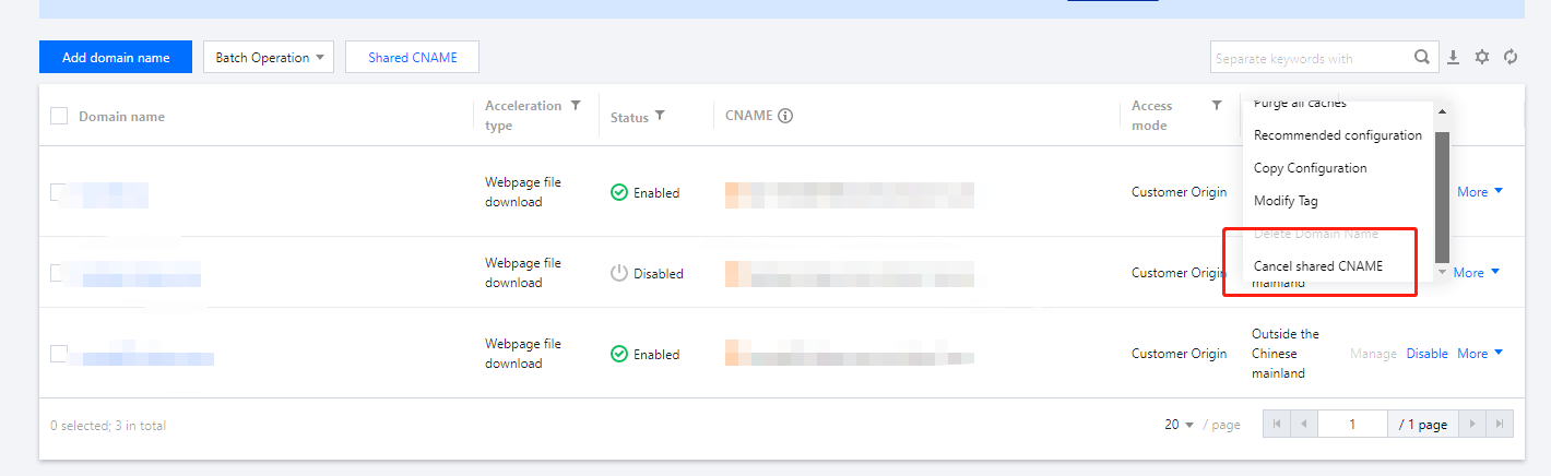 您可在当前已创建的共享 CNAME 中解绑已经绑定的域名,即对域名取消配置共享 CNAME。