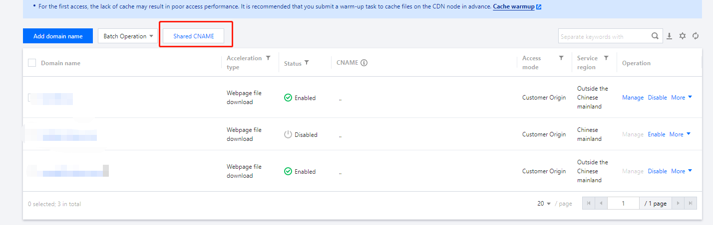 账号开启共享 CNAME 白名单后,登录 CDN 控制台,在左侧菜单栏选择域名管理,即可在页面上方看到共享 CNAME 按钮,单击即可进入共享 CNAME 功能页面。