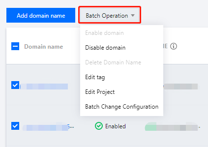 批量操作:勾选已关闭状态的域名,在上方批量操作中进行批量启动。