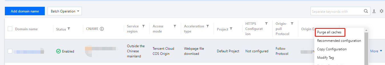 单击域名右侧的更多按钮,从弹出框中,可选择刷新全部缓存,用于一键刷新当前域名下的所有 CDN 节点内缓存资源,适用于该域名下有大批量资源更新时,快速清除节点上的旧缓存资源
