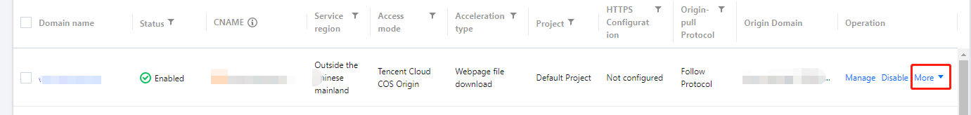 单域名操作:若域名状态为已关闭,可单击右侧更多操作开启域名。