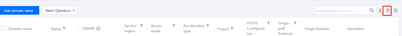 单击搜索框右侧 ,打开列表配置弹窗,可指定展示或取消展示某一些域名配置项,且支持调整列表展示顺序。