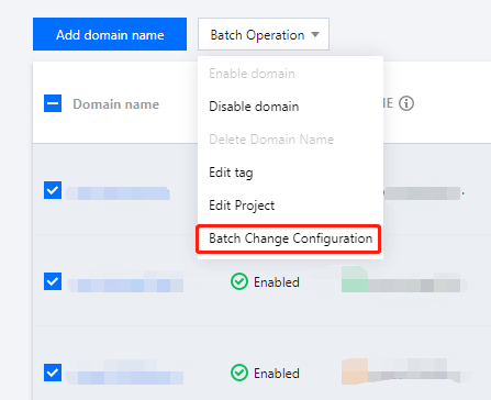 批量变更配置功能可同时对多个加速域名变更域名配置。当您需要对多个域名变更某项域名配置时,不用再一个一个域名地操作,可使用此功能进行批量操作,提升配置效率。详细说明请查看 批量变更配置。