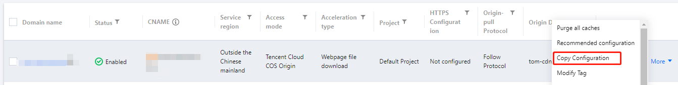 复制配置功能可将存量加速域名的配置复制到一个或多个新添加速域名。您可按需选择某一个存量域名,将其域名配置复制到新添域名上。详细说明请查看 复制配置。