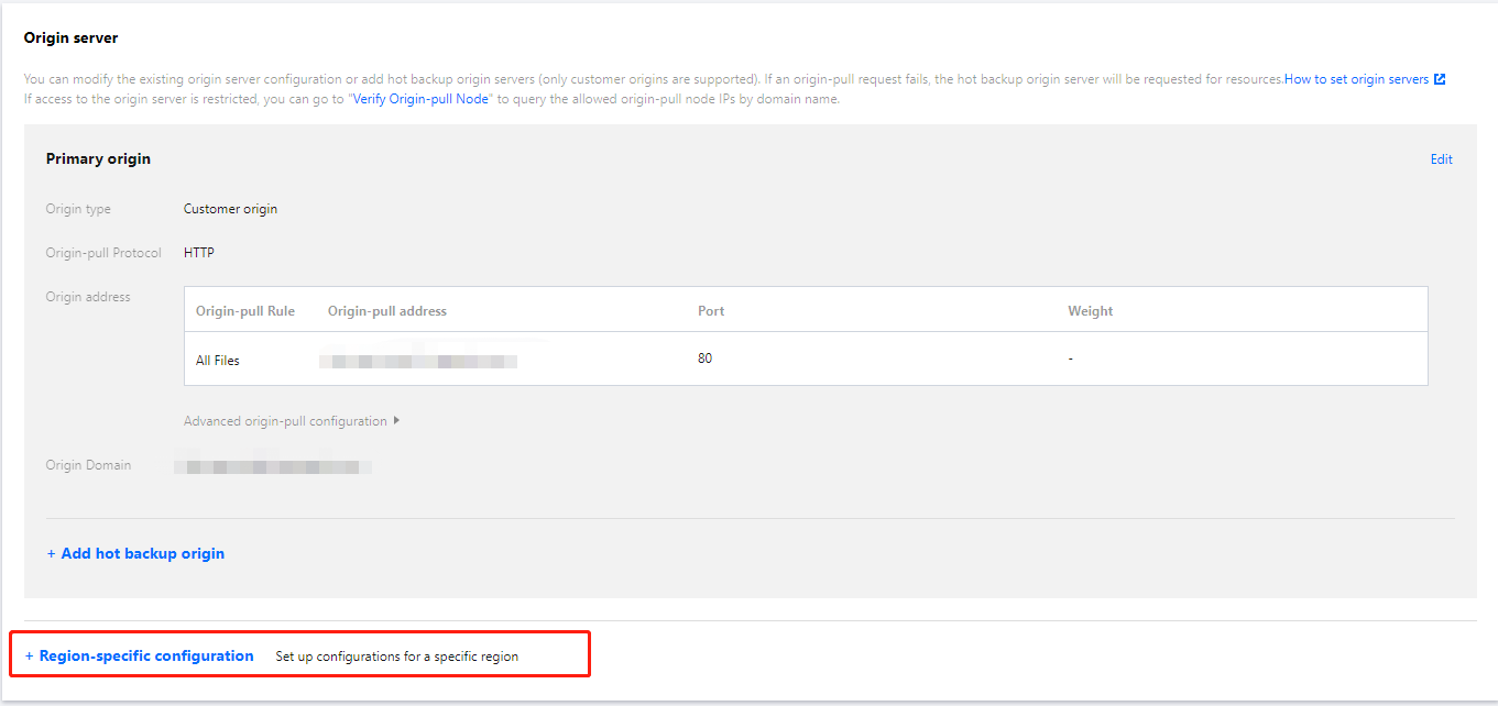 自有源 | 支持填充多个 IP 源站或域名(一行一个): 多 IP 轮询回源:支持填充多个 IP 源站(一行一个),轮询回源。CDN 默认开启源站检测能力,当某一个 IP 回源失败或回源超时次数在1分钟内超出5次时,则不再回源到此 IP 地址,会自动屏蔽 600s 后自动恢复。域名回源:支持单独配置一个域名作为源站,此域名不可与 CDN 加速域名相同。不支持 IPv6 域名回源。注:源站地址不可填写为已接入 CDN 加速且源站指向当前加速域名的站点,否则会造成循环解析,无法正常回源。 支持增加端口(0 - 65535)和权重(1 - 100)配置:源站:端口:权重(端口可缺省:源站::权重)注:权重按照数字大小进行排序,数字越大,权重越高,回源优先级越高。 源站地址处最多可输入511个字符。 |