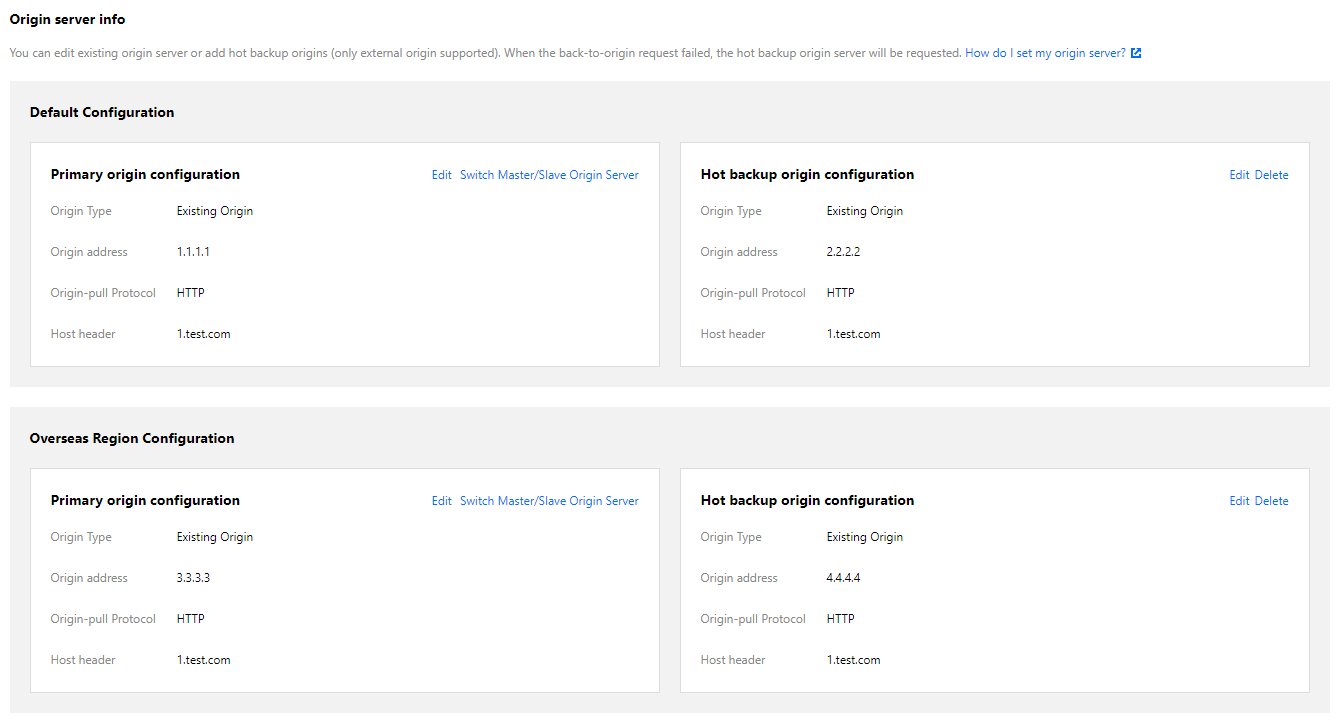 http://www.test.com/test.txt文件,境内节点尚未缓存该资源,则回源请求到达服务器1.1.1.1,找到 Web 网站1.test.com下的 test.txt 文件,若有该资源则直接返回给客户,若无,则进行步骤2。2.2.2.2,找到 Web 网站2.test.com下的 test.txt 文件,返回给用户并进行缓存。http://www.test.com/test.txt文件,境外节点尚未缓存该资源,则回源请求到达服务器3.3.3.3,找到 Web 网站3.test.com下的 test.txt 文件,若有该资源则直接返回给客户,若无,则进行步骤4。4.4.4.4,找到 Web 网站4.test.com下的 test.txt 文件,返回给境外用户并进行缓存。文档反馈
