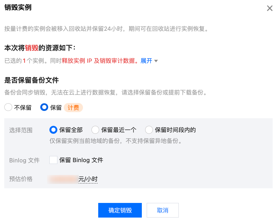 保留 | 选择保留,表示实例销毁后,会根据选择的范围保存备份,选择范围的选项如下: 保留全部:表示保留该实例在当前地域产生的全部备份,可选择是否保留 Binlog 文件。 保留最近一个:表示保留该实例在当前地域产生的最新的1个备份,默认不可选择保留 Binlog 文件。 保留时间段内的:表示保留该实例在当前地域产生的,并且从所选时间之后产生的备份,可选择是否保留 Binlog 文件。例如:选择保留2025年04月28日之后产生的备份。 |