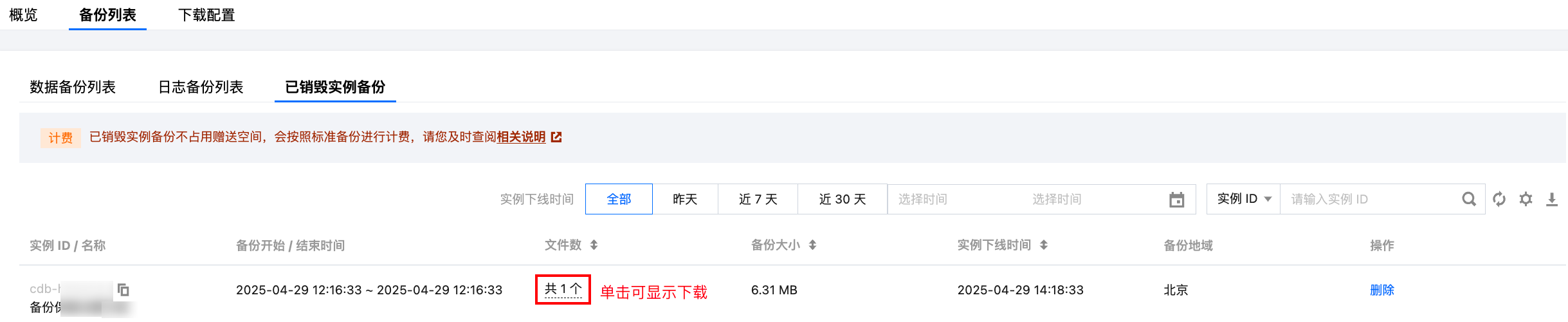 实例销毁后,符合保留策略的备份文件不会立即出现在数据库备份 > 备份列表 > 已销毁实例备份的列表中。