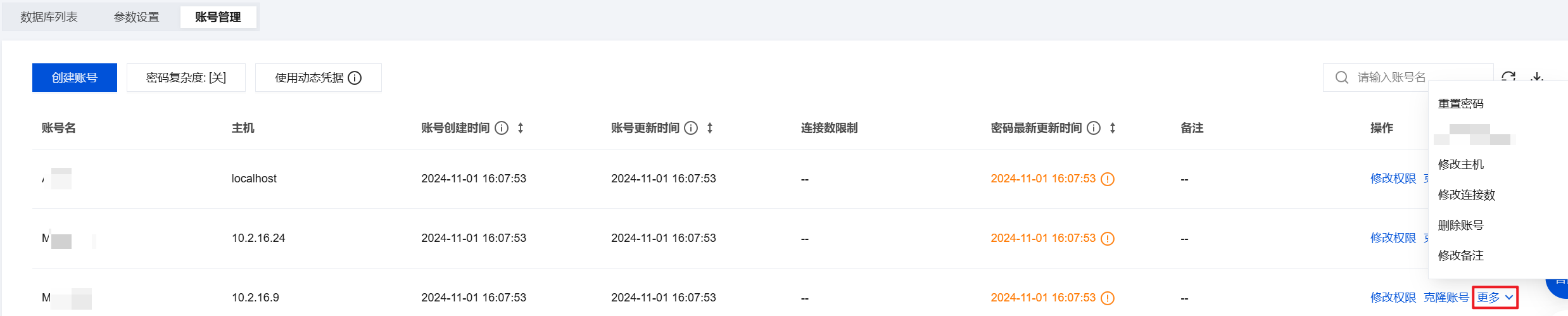1. 登录 MySQL 控制台,在实例列表,单击实例 ID 或操作列的管理,进入实例管理页面。 2. 在实例管理页面,选择数据库管理 > 账号管理页,找到需要重置密码的账号,单击重置密码或选择更多 > 重置密码。