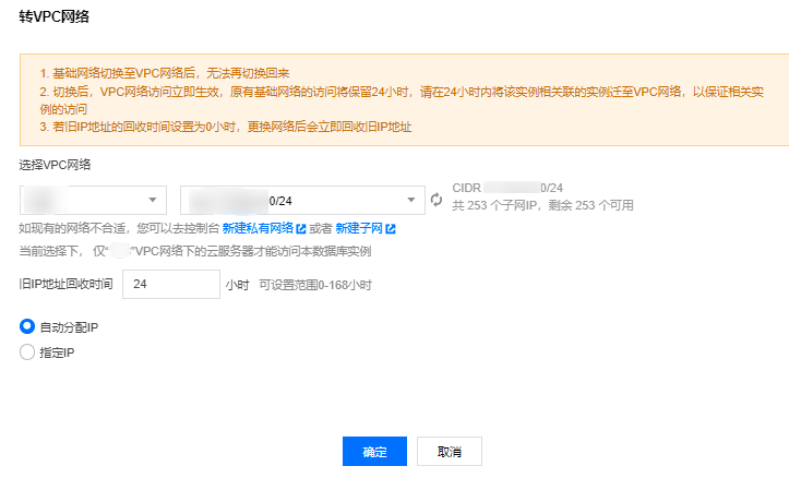 基础网络切换为私有网络:支持单台云数据库主实例的基础网络切换至私有网络。
