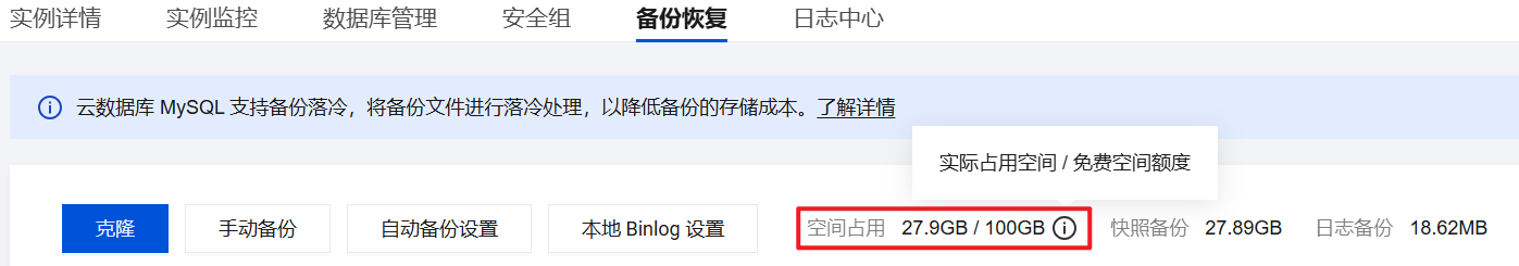 1. 登录 MySQL 控制台,在实例列表,单击目标实例 ID 或操作列的管理,进入实例管理页面。 2. 在实例管理页面,选择备份恢复,即可查看该实例对应的实际占用空间和免费空间额度。