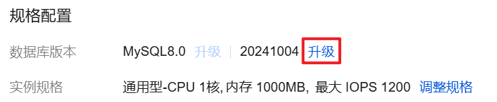 1. 登录 MySQL 控制台,在实例列表,找到目标实例,单击实例 ID 或操作列的管理,进入实例详情页。 2. 在实例详情页的配置信息处,单击升级。