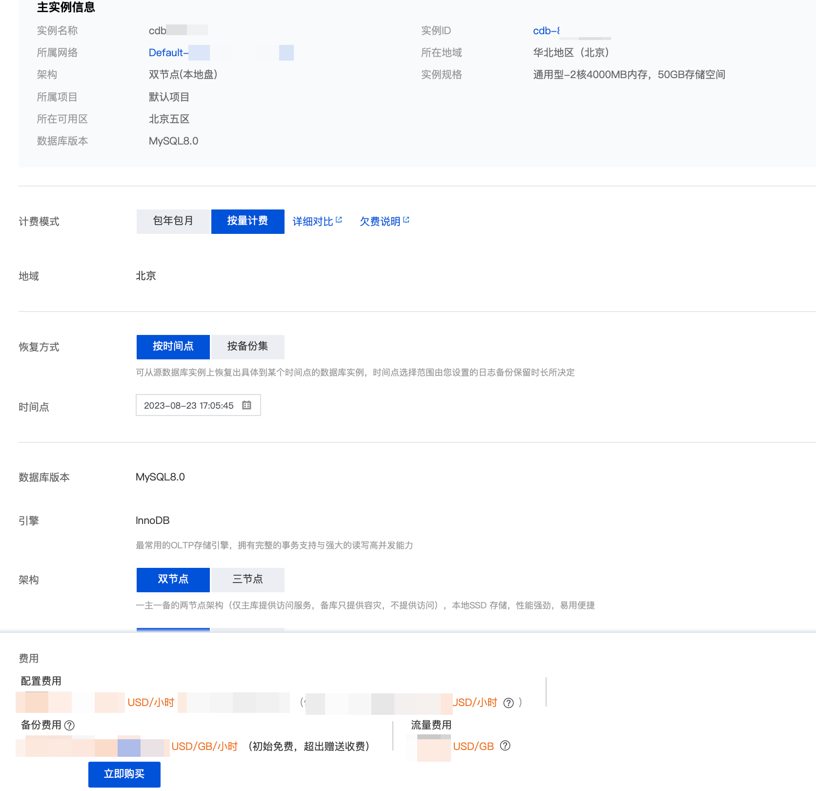 3. 进入购买页,选择克隆实例的克隆方式和相应配置,确认无误后,单击立即购买。