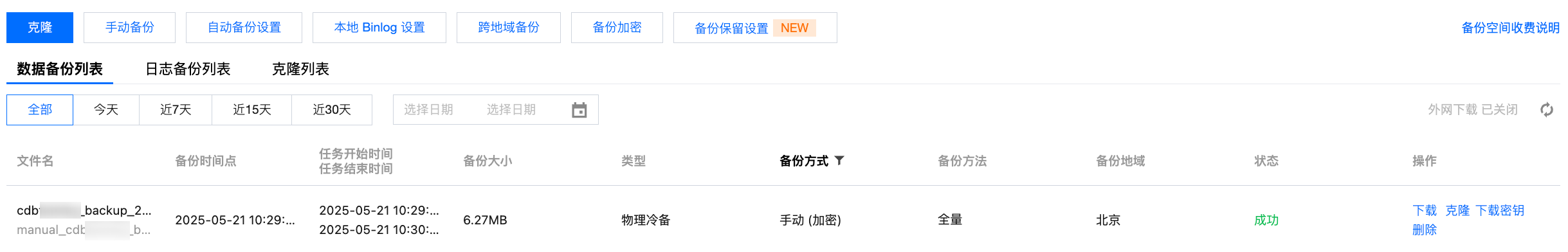 4. 购买成功后,可在备份恢复 > 克隆列表页下查看克隆详情。