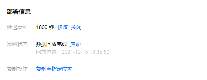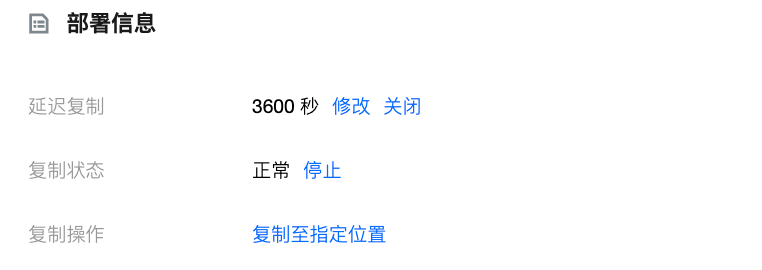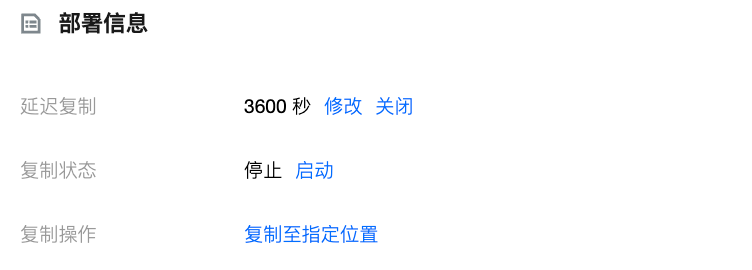 4. 也可在部署信息 > 复制操作选择复制到指定位置,支持启动到具体时间点和对应 GTID,恢复到具体时间点或对应 GTID 后,只读实例后续将会停止复制直至切换为正常启动方式,才会继续进行复制。