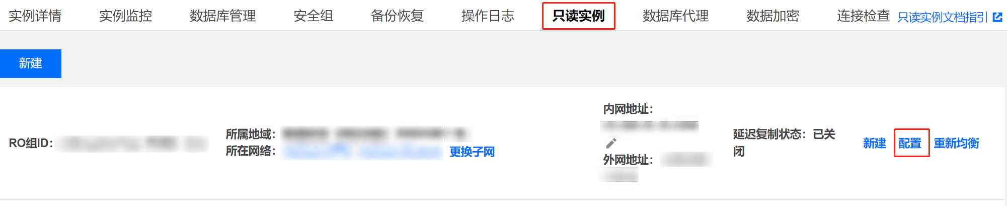 只读实例“延迟复制”默认为“不开启”,开启后会显示延迟复制时间。