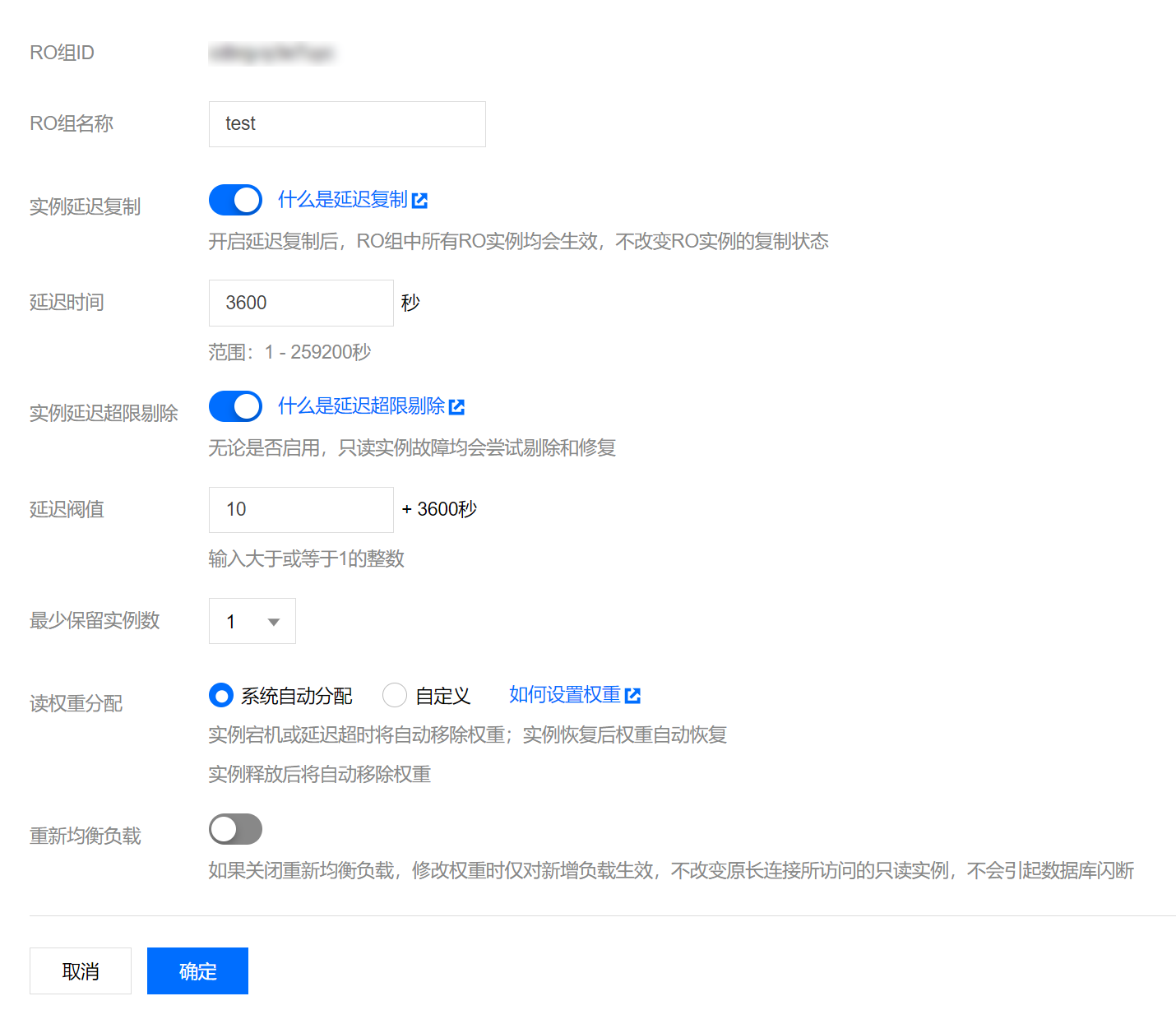 最少保留实例数:组内需要保证的实例下限数,若现有只读实例数小于等于此下限且延迟时间超过阈值,现有只读实例均不被剔除。