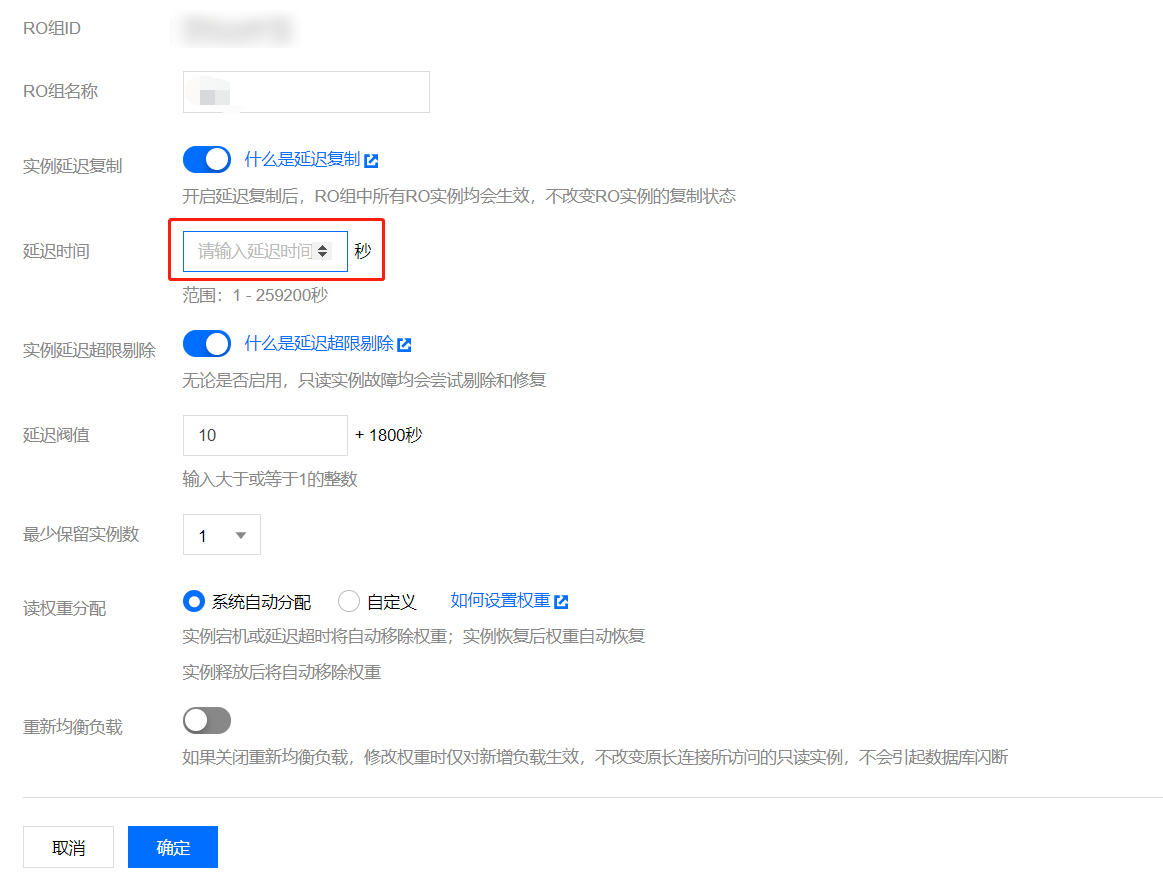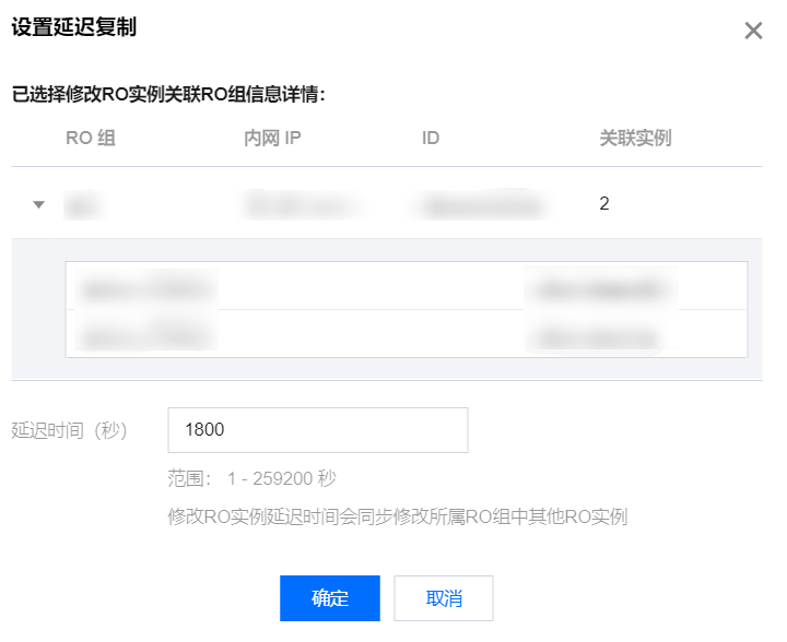 延迟时间:只读实例与主实例间的延迟复制时间,可设置范围:1秒 - 259200秒。