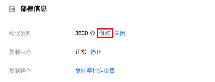 2. 在只读实例详情页的部署信息 > 延迟复制处,单击修改。