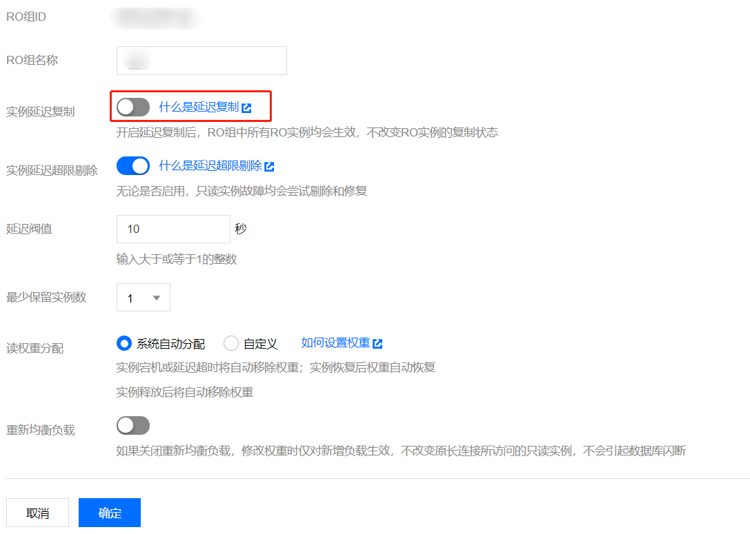 3. 在 RO 组配置页,配置 RO 组信息里开启实例延迟复制,设置延迟时间,单击确定。