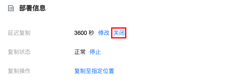 2. 在只读实例详情页的部署信息 > 延迟复制处,单击关闭。