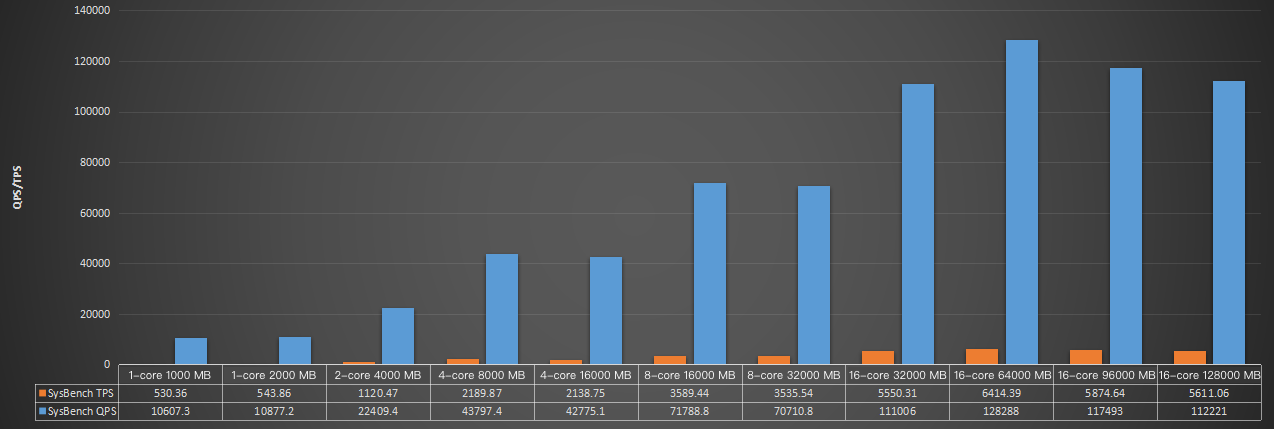 CPU (core) | 内存 (MB) | 并发度 | 单表数据量 | 表总数 | SysBench TPS | SysBench QPS | avg_lat |