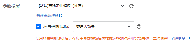 购买 MySQL 实例时,您可在选定参数模板后,选择是否开启场景智能调优,使用场景智能调优后,系统会根据您选择的参数模板以及对应的业务场景进行二次调整,业务场景有三种,包括:交易类场景、OLTP 性能测试、压力测试。