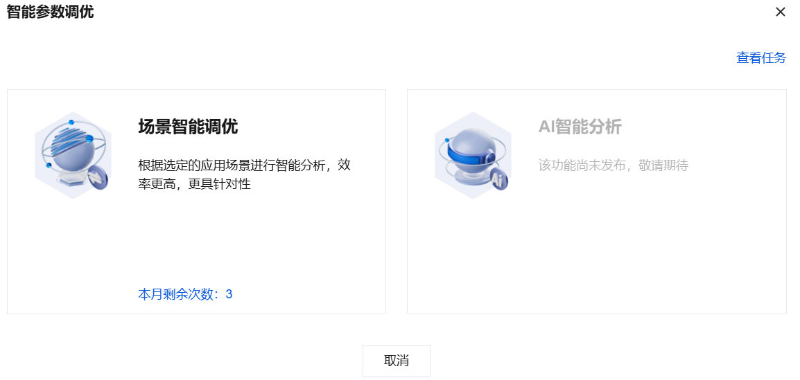3. 在智能调优弹窗,选择场景智能调优或者AI 智能分析的参数调优方式,配置好后单击开始分析。
