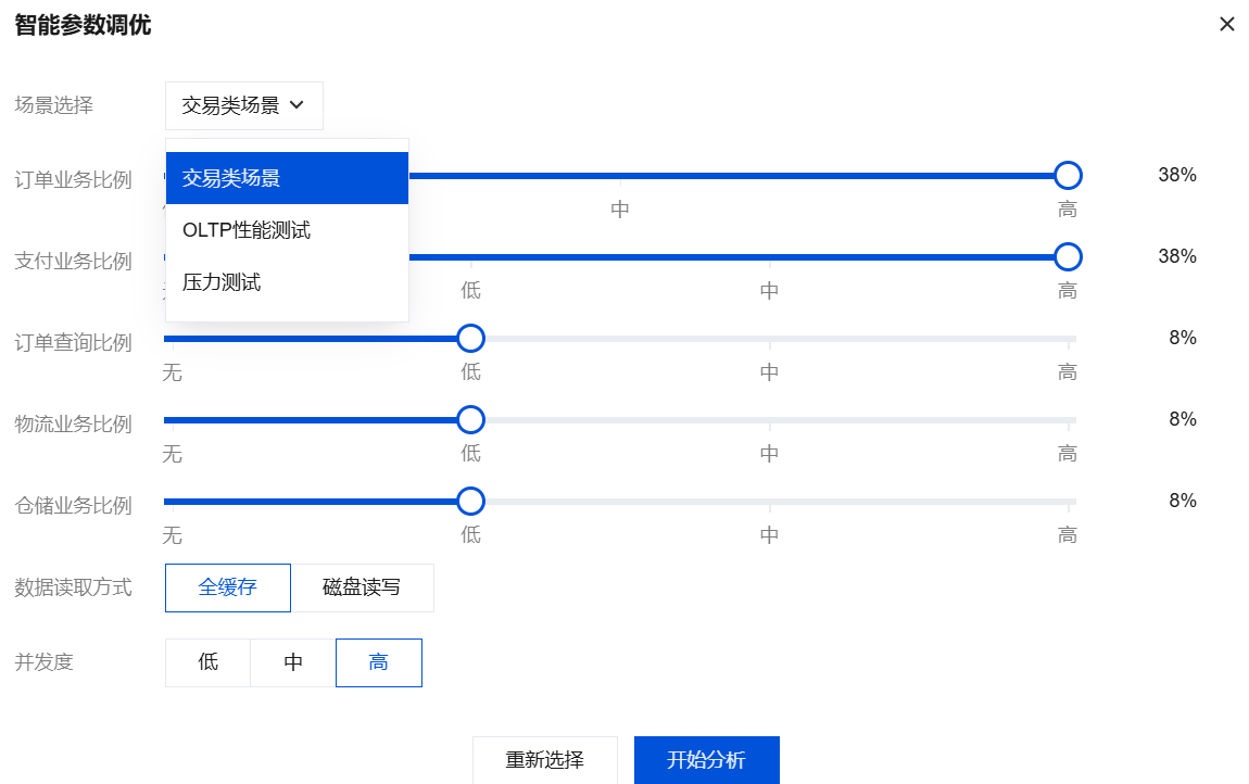 选择对应场景后,您可自定义该场景下的业务占比,便于系统更精确地进行分析。配置完成后单击开始分析。