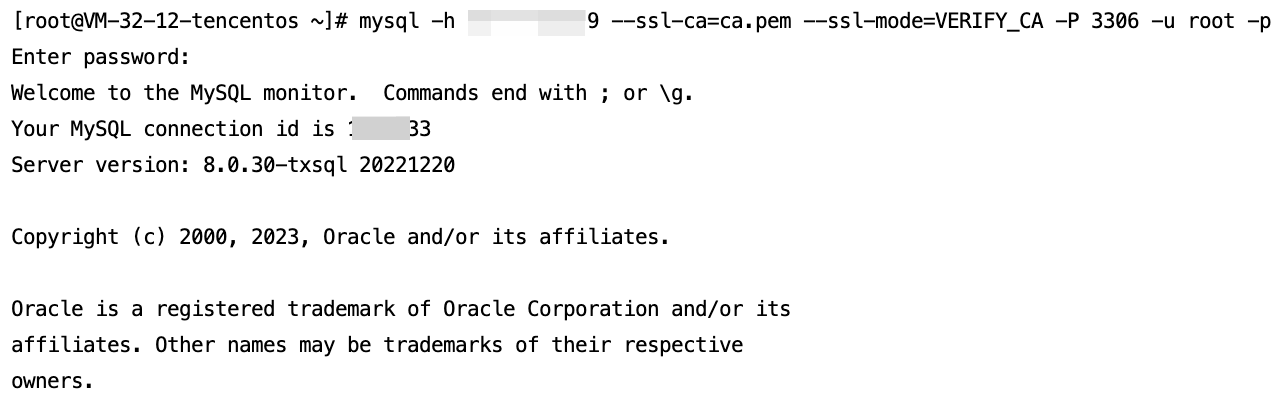 mysql -h <IP 地址> --ssl-ca=<ca证书> --ssl-mode=VERIFY_CA -P <端口号> -u <用户名> -p