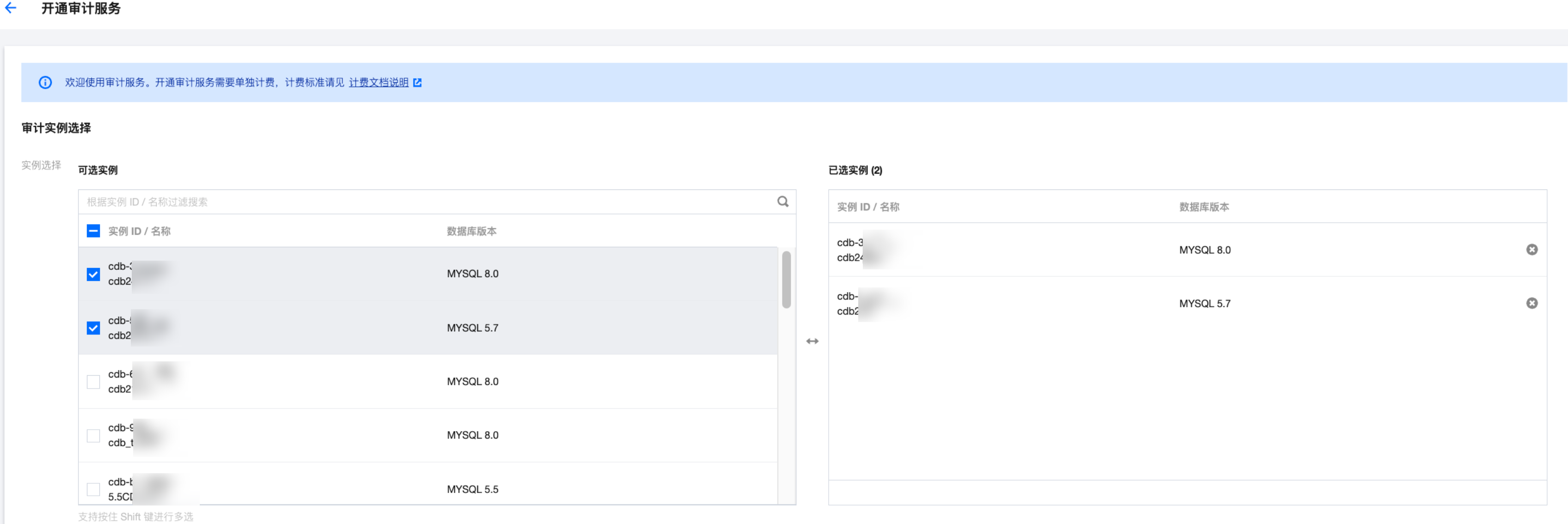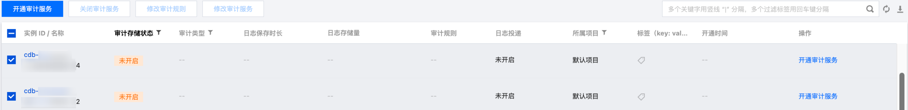 支持批量开通审计服务。在审计实例列表页勾选多个目标实例,单击上方开通审计服务即可进入设置界面。