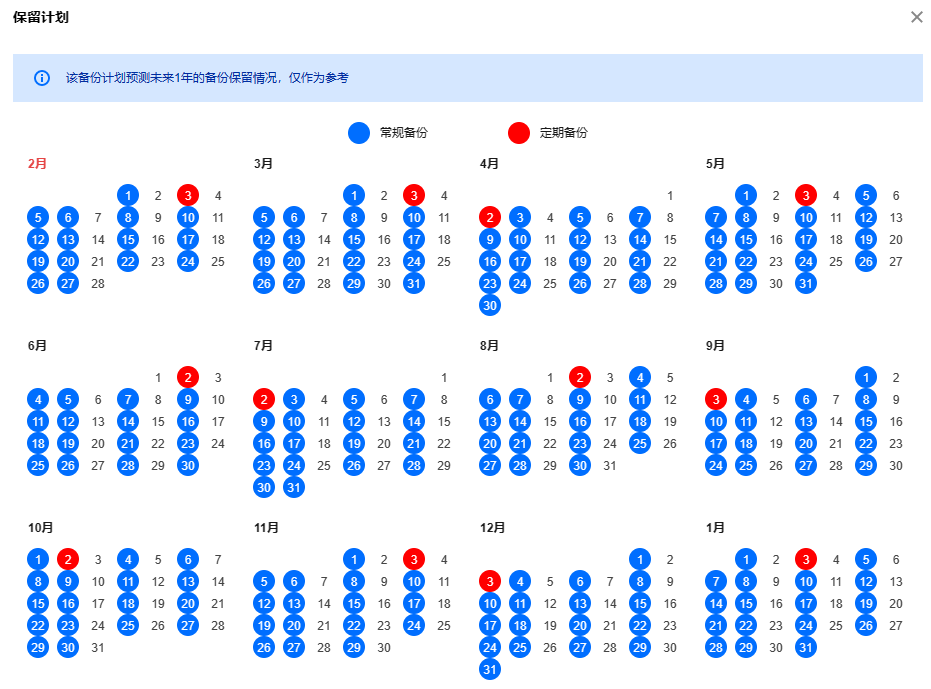 新增备份文件:以2023年2月1日为起点,新生成的备份文件超过90天后将沉降至标准存储,超过180天后将沉降至归档存储。