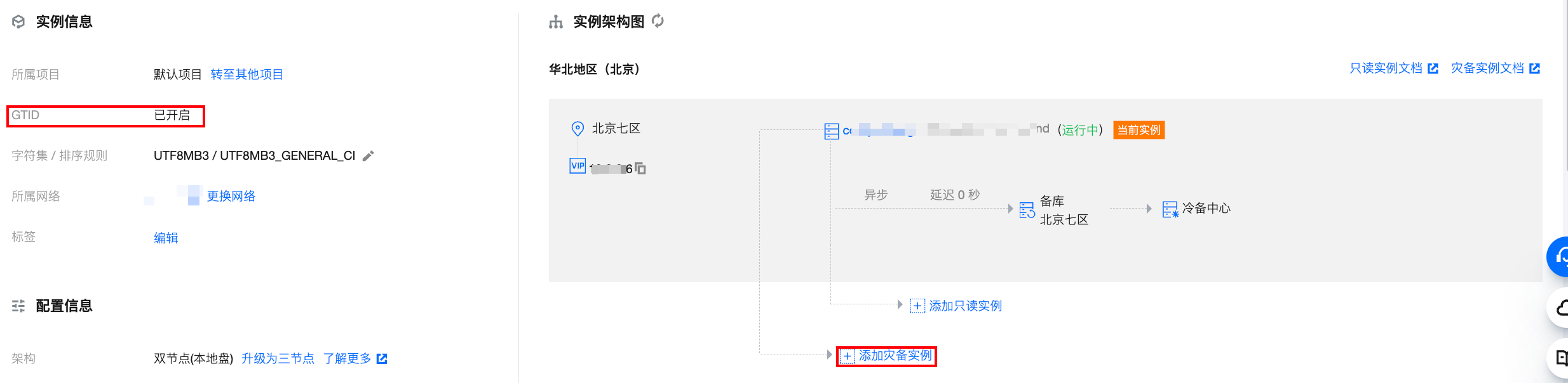 2. 在实例详情页的基本信息中确认 GTID 功能开启,在实例架构图中单击添加灾备实例,进入灾备实例购买页。