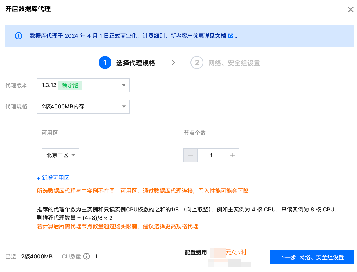 可用区及节点个数 | 1. 选择数据库代理可用区,支持单击新增可用区来多选,可选择的可用区数量与当前地域可选可用区数量相关,最多支持选择三个可用区。 2. 选择节点个数,推荐的代理节点个数为主实例和只读实例 CPU 核数的之和的1/8(向上取整),例如主实例为4核 CPU,只读实例为8核 CPU,则推荐代理数量 = (4 + 8) / 8 ≈ 2。 注意: 如果所选数据库代理与主实例不在同一可用区,通过数据库代理连接时,写入性能可能会下降。 若计算推荐节点个数后所需代理节点数量超过购买限制,建议选择更高规格代理。 |
