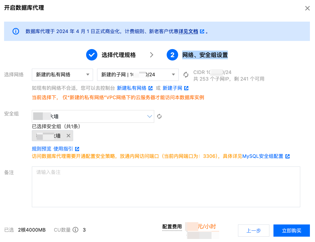 备注 | 非必填项,可为要开通的数据库代理服务进行备注。 |