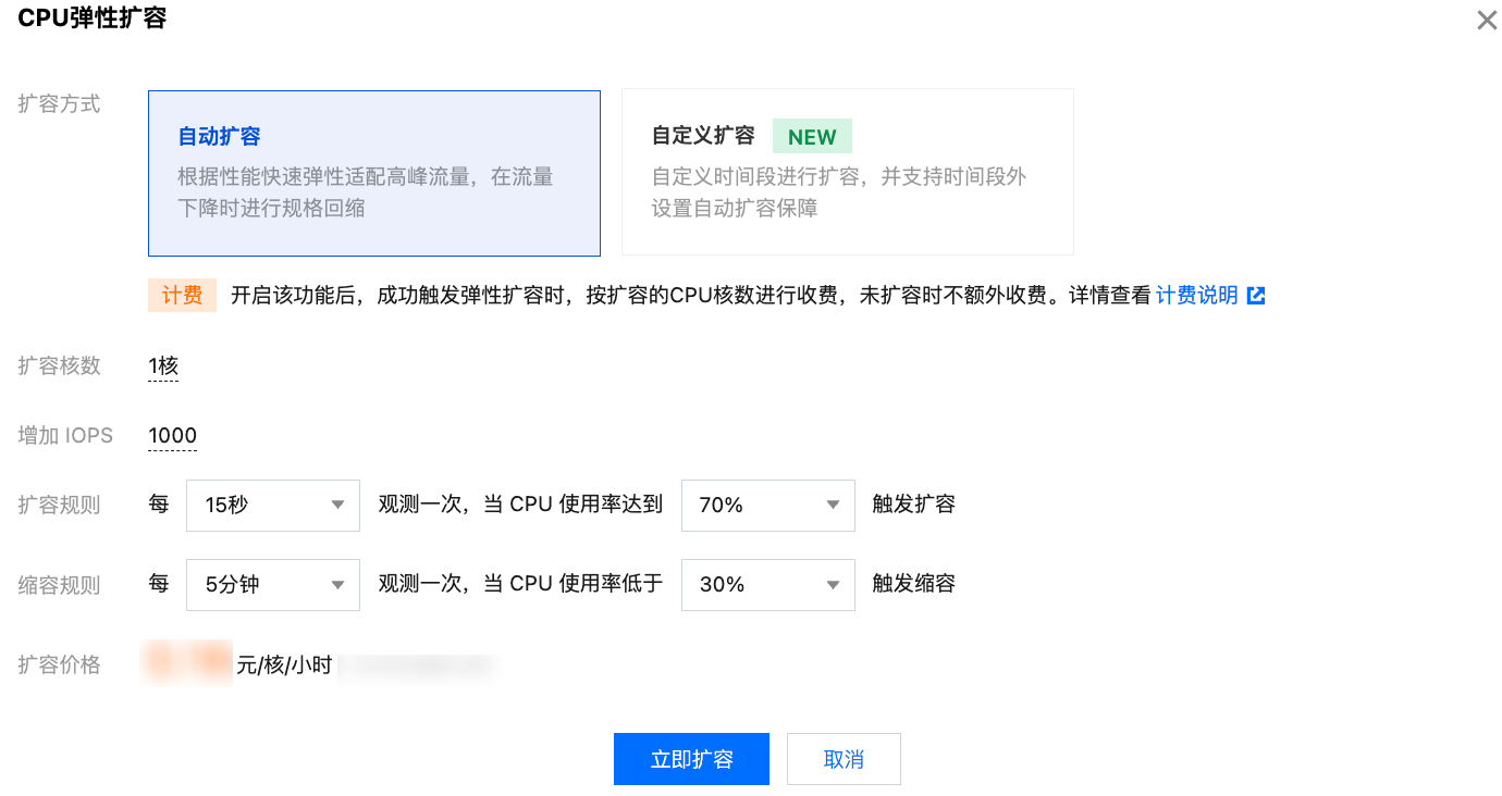 3. 在 CPU 弹性扩容窗口下,完成如下配置,确认扩容费用,单击立即扩容。
