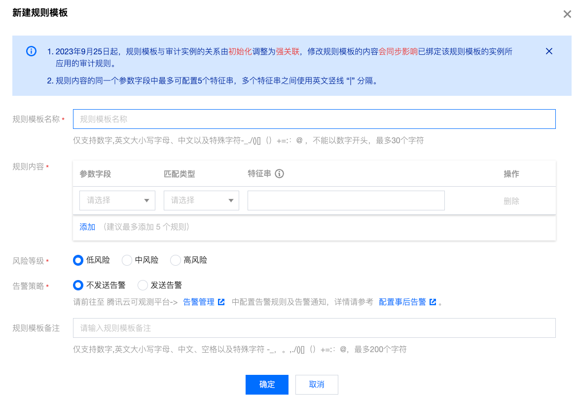 风险等级 | 为新建的规则模板选择风险等级,支持选项为低风险、中风险、高风险。 |