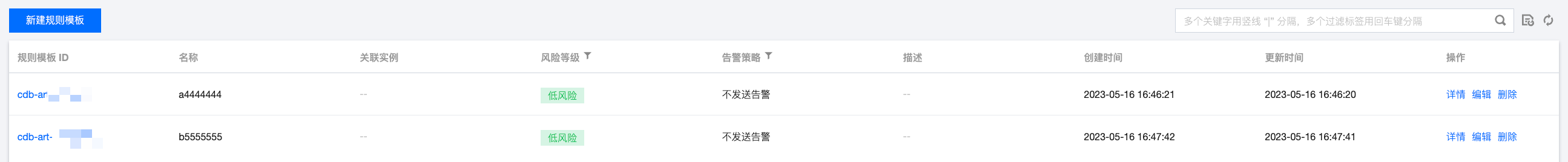 若规则模板有关联实例,则不支持删除,仅规则模板没有绑定实例时,才支持被删除,规则模板删除后,将不能应用于实例。