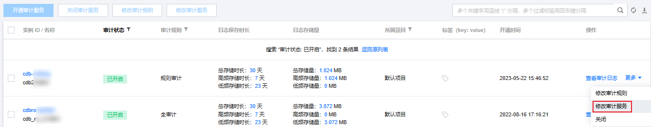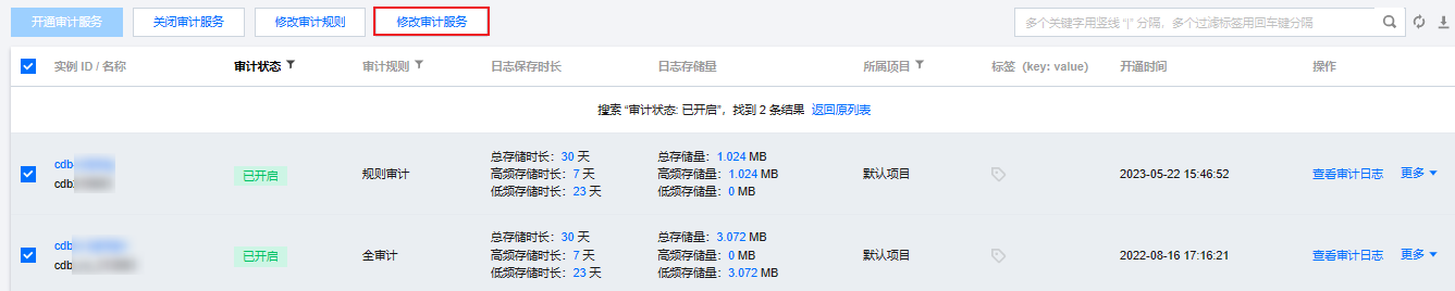 4. 在审计实例列表里找到目标实例(也可在搜索框通过资源属性筛选快速查找),在审计实例列表页勾选多个目标实例,单击上方修改审计服务。