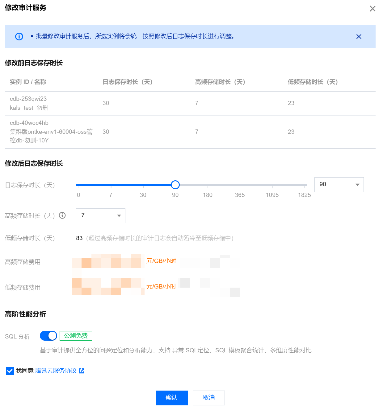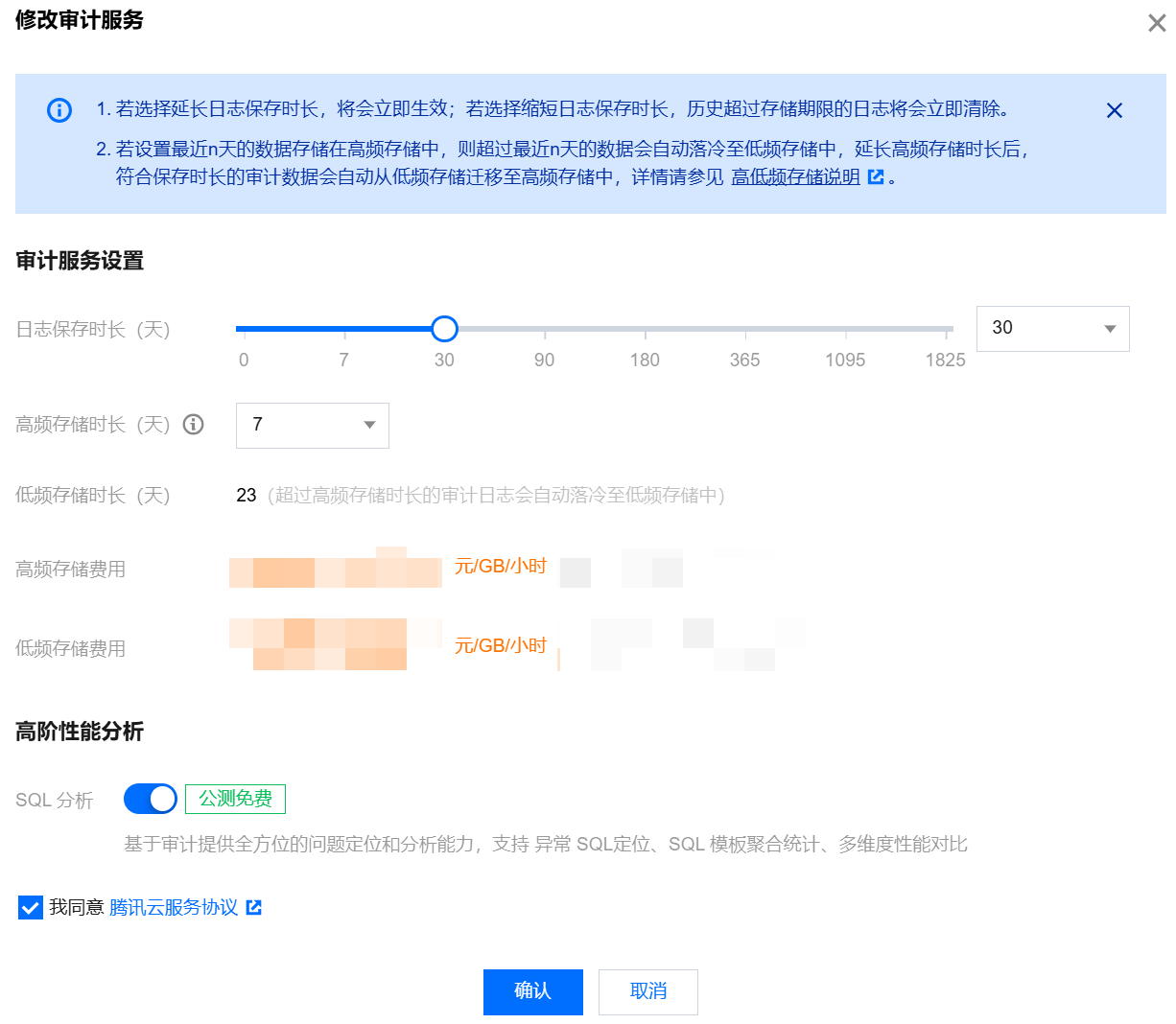 5. 在修改审计服务页面,修改日志保存时长或高频存储时长后,单击确认。