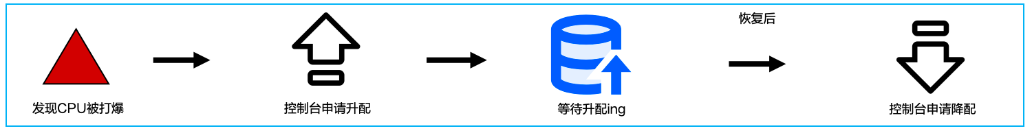 当发现 CPU 被打爆时,由用户通过控制台手动申请升配操作,然后等待升配完成,升配完成的时间受数据量影响,等待时长不确定,且升配过程中可能会出现闪断,会影响业务的正常运行,从升配完成到业务流量恢复平稳后,还需要人工通过控制台申请降配。综上,传统解决方案存在需要反应迅速、预期时间不定、有闪断风险、后续工作较多的不足。