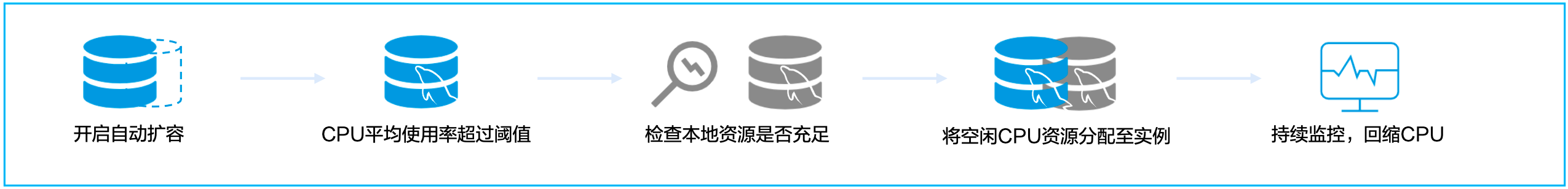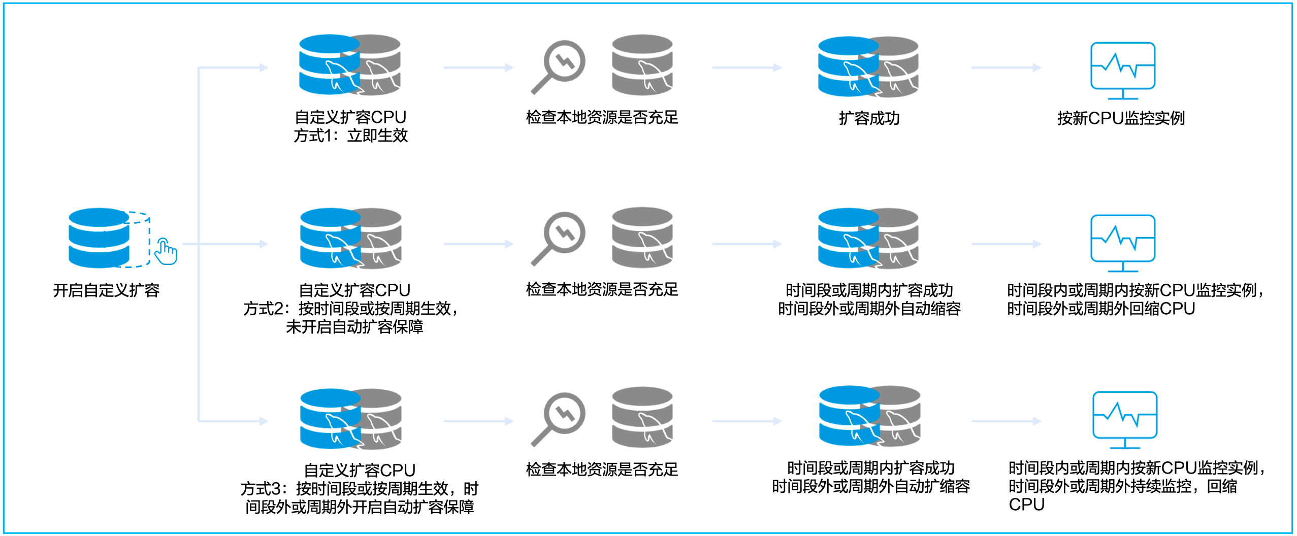 CPU 弹性扩容功能基于云环境优势,可实现动态分配 CPU 资源(当数据库访问量增加或 CPU 资源占用率上升时,可以自动添加更多的 CPU 资源,并在高峰期结束后自动缩减)。用户可在控制台上选择是否开启 CPU 弹性扩容功能,根据业务的需求和业务量动态地配置数据库的 CPU 资源,从而完成弹性扩展,应对高峰压力,确保数据库实例的高性能、高可用性和高稳定性。