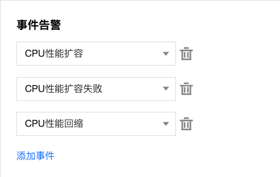 触发条件:找到事件告警,单击添加事件,分别添加 CPU 性能扩容、CPU 性能扩容失败、CPU 性能回缩告警事件。