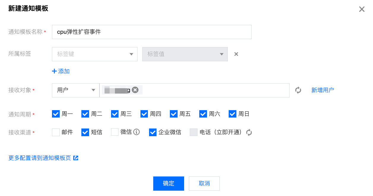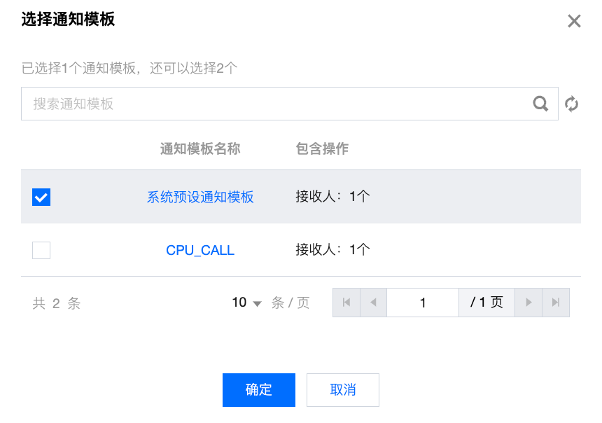 配置告警通知:支持选择系统预设通知模板和用户自定义通知模板,每个告警策略最多只能绑定三个通知模板,自定义通知模板请参见 新建通知模板。 选择系统预设模板